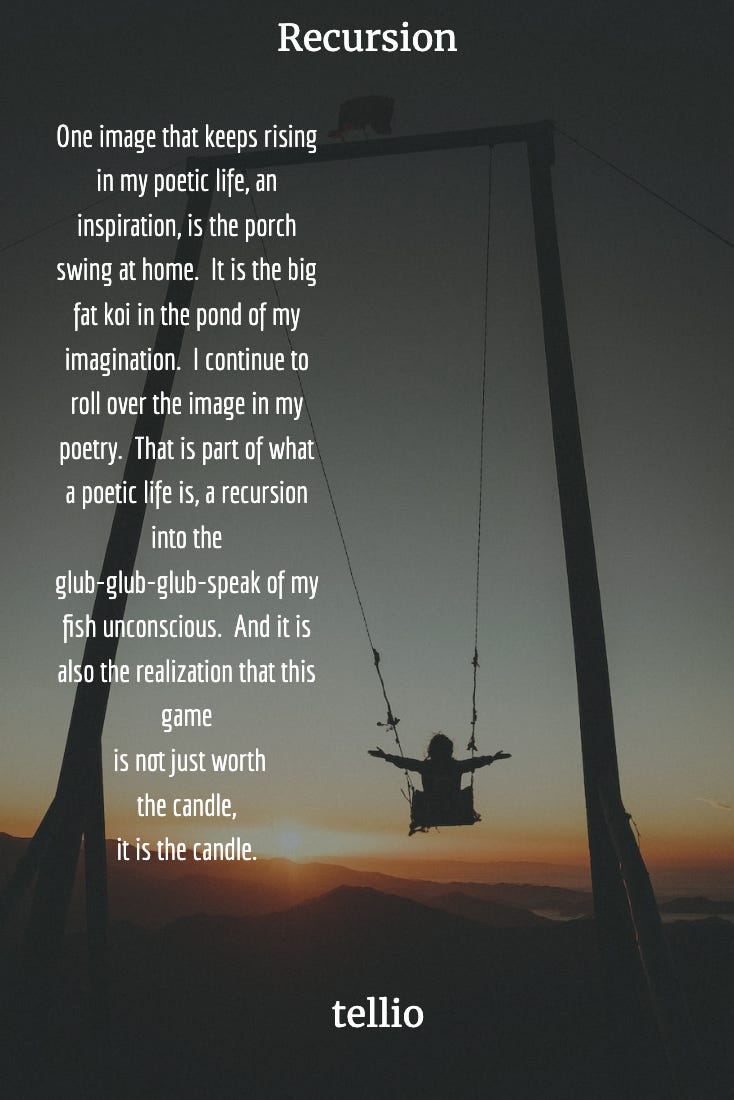 Playback speed×Share postShare post at current timeShare from 0:000:00/0:00TranscriptThe Swing a-Swing, SwingingImbued with the magic of every morning, the porch swing takes flight.Terry ElliottSep 22, 2024ShareTranscriptIt always (and by ‘it’ I mean life)always comes downfor me to theordinary acts of anonymous livingpiled highand heatedand smithed…and again and again and againuntil it becomesmemory—perdurableand fizzing.Discussion about this videoCommentsRestacksTerry’s Substack PodcastMy personal SubstackMy personal SubstackSubscribeListen onSubstack AppRSS FeedAppears in episodeTerry ElliottRecent EpisodesDrones Up!Jan 4 • Terry ElliottThe Christmas SkaterDec 23, 2024 • Terry ElliottMorning WalkSep 8, 2024 • Terry ElliottAdvice for CreativesAug 21, 2024 • Terry ElliottEnso SwingJan 21, 2024 • Terry Elliott